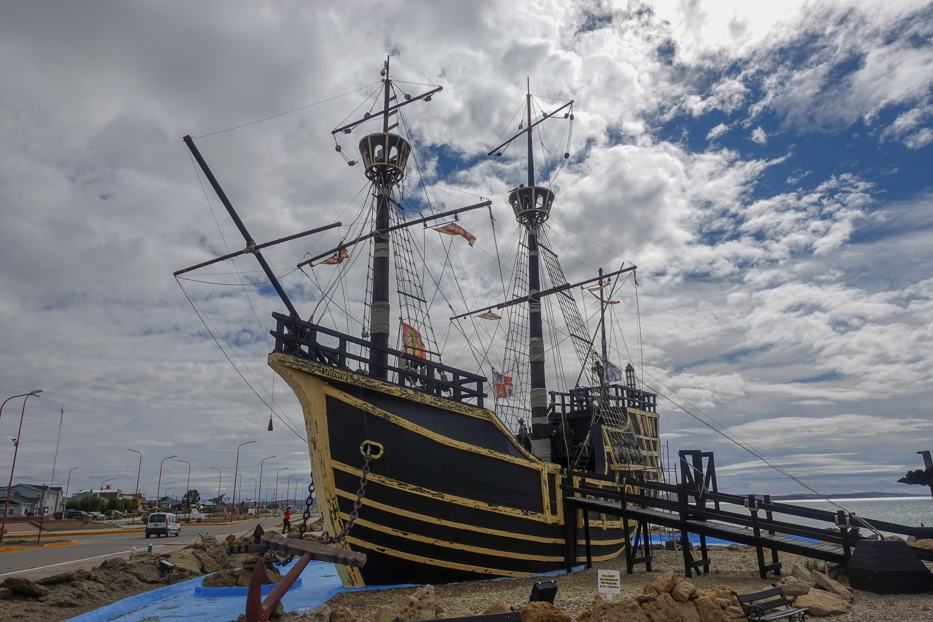 Wir fahren weiter Richtung Puerto San Julián und übernachten dort auf dem städtischen Campingplatz. An diesem Ort legte im 16. Jh. Magellans Flotte an und überwinterte. Sie trafen hier auf Einheimische und beschrieben diese als „Riesen“ und nannten diese Patagonier, was so viel wie „Großfüße“ bedeutet. Am nächsten Morgen schauen wir uns hier einen Nachbau eines der Schiffe an - zufälligerweise mit dem Schweizer Pärchen, mit der wir die Nacht vor Península Valdés am Strand verbracht haben. Die beiden machen sich danach auf Richtung Ushuaia und wir wollen in den Westen Richtung Berge. Die Reiserouten sind hier alle recht ähnlich, so dass man die selben Traveller öfter trifft, was sehr schön ist, wenn man „alte Bekannte“ wieder sieht.